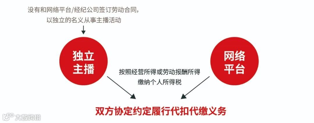 是一部分独立的主播,通常没有和网络平台或者经纪公司签订劳动合同,以独立的名义从事主播活动。这种情况下,获得的收入应该按照经营所得(5%-35%)或劳动报酬所得(20%-40%)缴纳个人所得税,网络平台根据双方协定约定履行代扣代缴义务。
