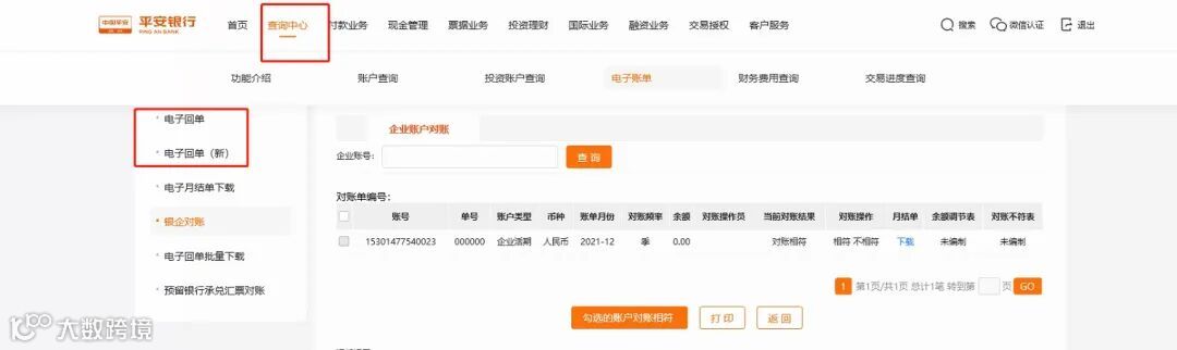 三,企业对账:点击“查询中心”-》“电子账单”-》“银企对账”