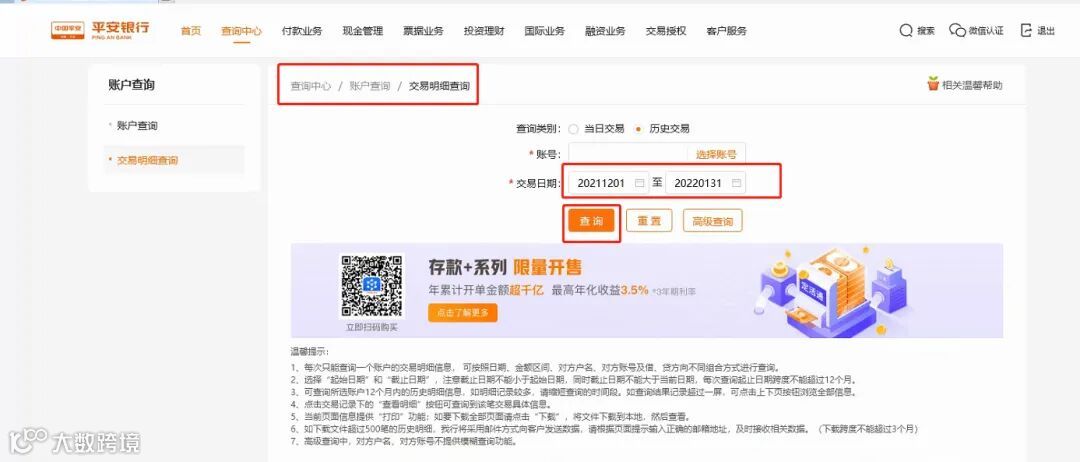 点击“查询中心”-》“账户查询”-》“交易明细查询”,选择“历史交易”,点击“选择帐号”自动弹出公司账号,选择交易起止日期(建议整月或者整个季度),点击“查询”,弹出帐务明细清单,点击下方“打印”。