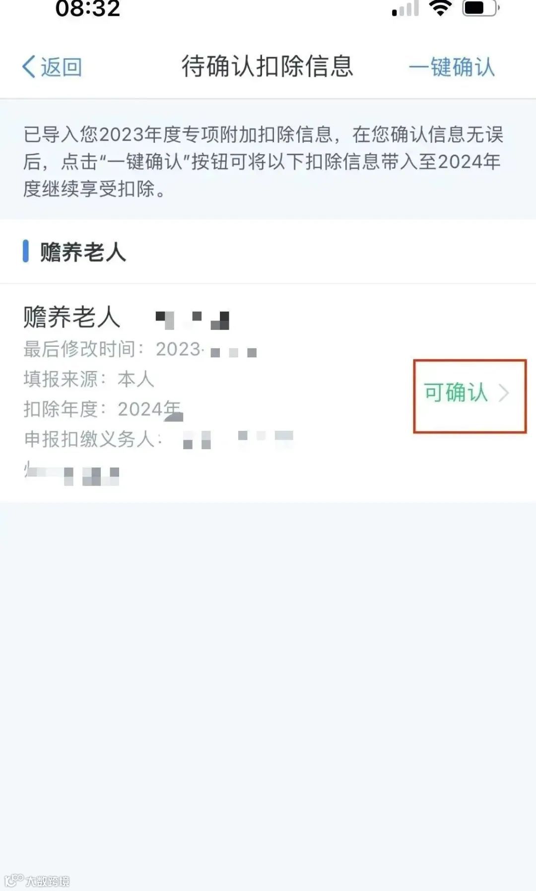 进入待确认扣除信息页面,请逐项点击【可确认】,核对信息是否准确,确认无误后点击【返回】,在页面右上角点击【一键确认】。