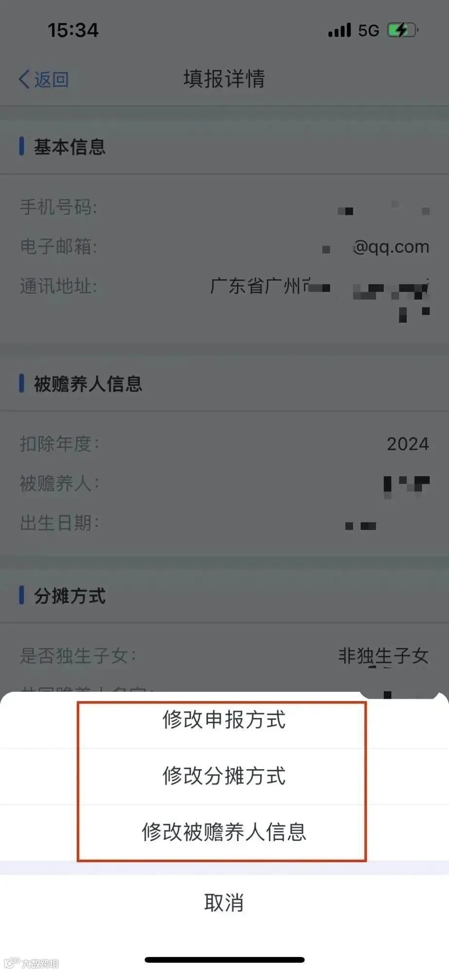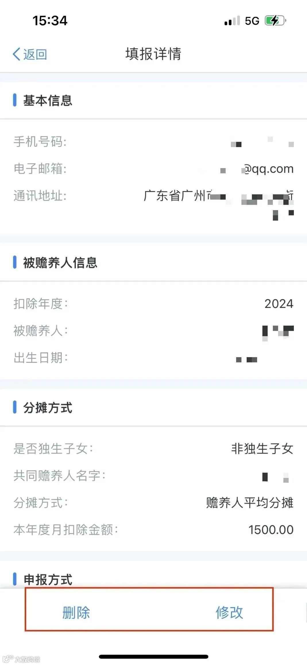 在填报详情页面,点击【删除】或【修改】,可按提示选择修改申报方式、分摊方式或被赡养人信息。