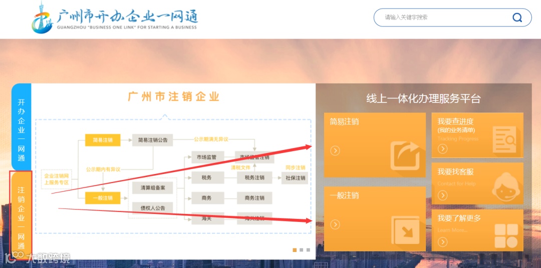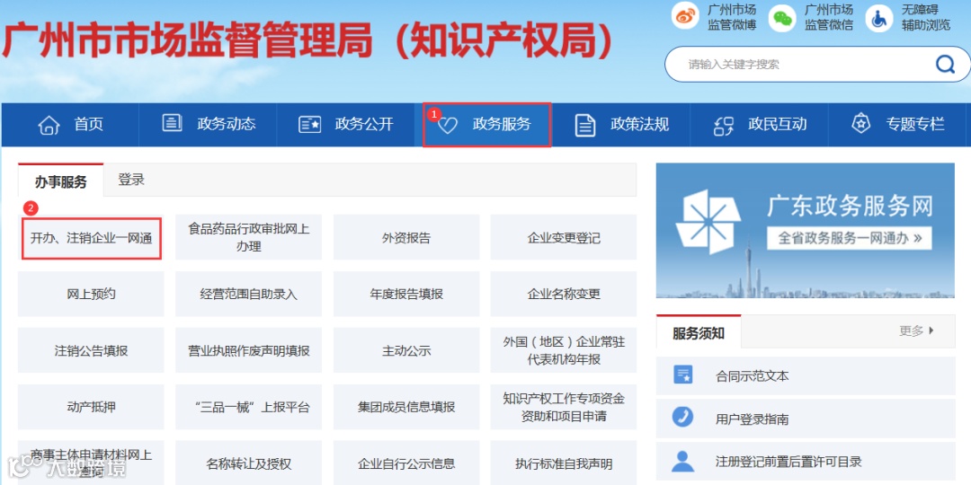 填报入口路径②:广州市市场监督管理局→政务服务→开办、注销企业一网通。