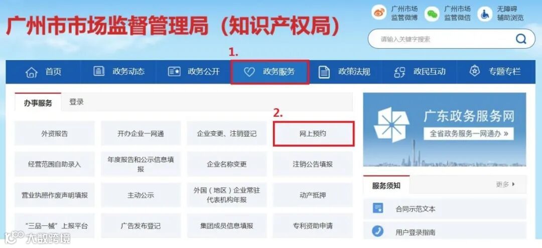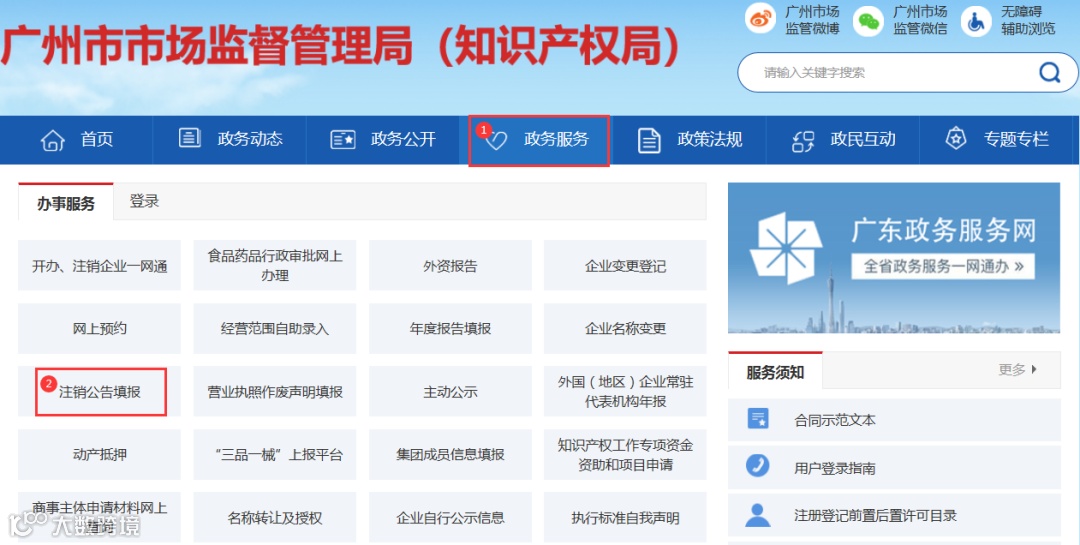 填报入口路径①:广州市市场监督管理局→政务服务→注销公告填报。
