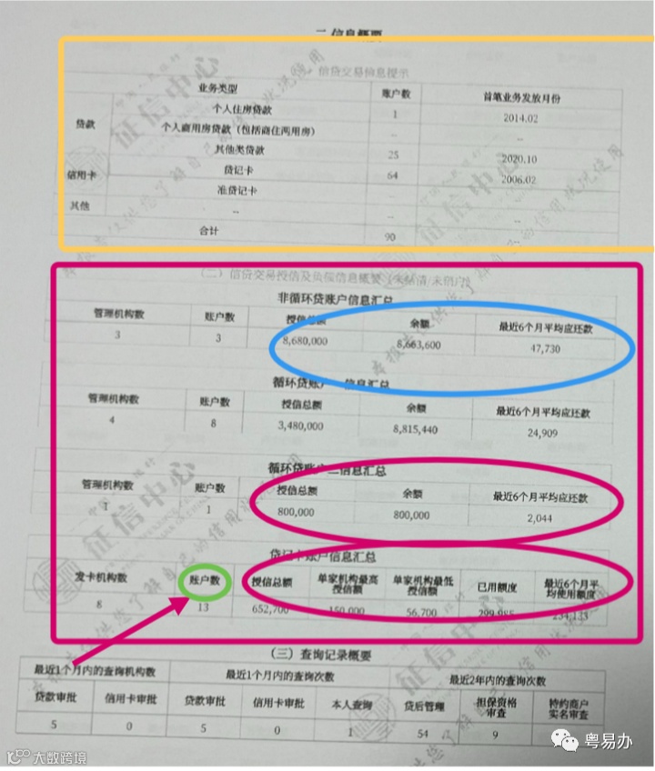第二部分的信息概要主要体现的是本人名下贷款与信用卡的汇总情况,包括总负债,过往逾期情况,贷款总额,贷款余额,担保等等。