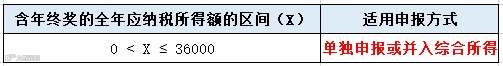 (2)当年收入(含年终奖)减去6万及三险一金、附加扣除等后应纳税所得额≤36000