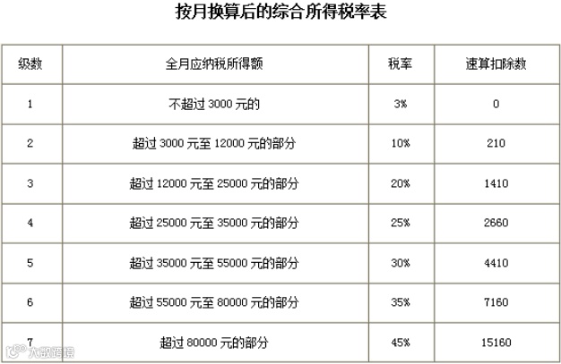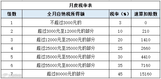 适用税率:以全年一次性奖金收入除以12个月得到的数额对照月度税率表确定: