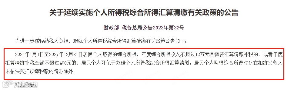 2024年1月1日至2027年12月31日居民个人取得的综合所得,年度综合所得收入不超过12万元且需要汇算清缴补税的,或者年度汇算清缴补税金额不超过400元的,居民个人可免于办理个人所得税综合所得汇算清缴。居民个人取得综合所得时存在扣缴义务人未依法预扣预缴税款的情形除外。