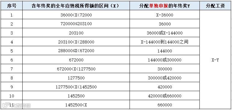(3)当年收入(含年终奖)减去6万及三险一金、附加扣除等后应纳税所得额>36000当含年终奖的全年应纳税所得额大于36000时,由于年终奖单独申报存在雷区等原因,为使税负最低,可在年终奖和工资之间进行分配,分配的年终奖按照全年一次性奖金单独申报。