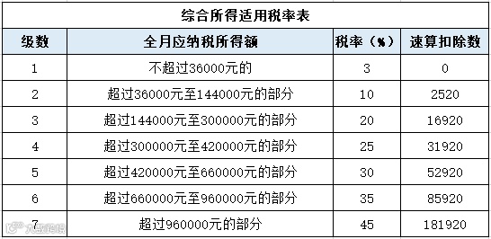 综合所得是指居民个人取得的工资、薪金所得;劳务报酬所得;稿酬所得和特许权使用费所得,适用百分之三至百分之四十五的超额累进税率(预扣率表见前述一、二)。