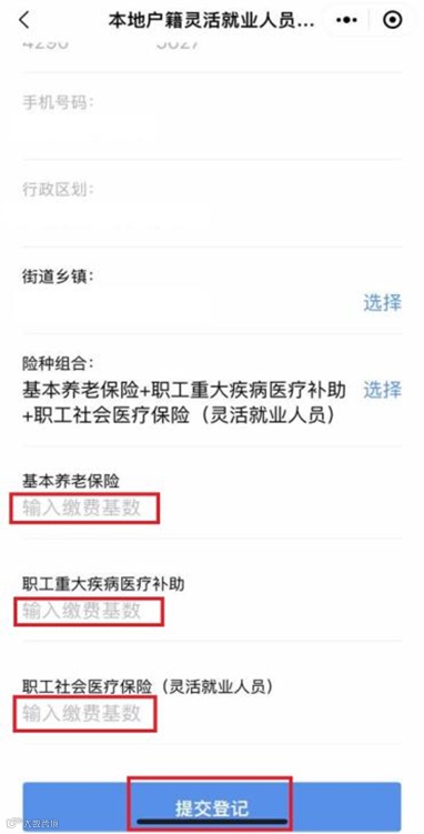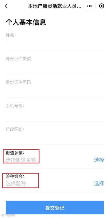 (5)选择“本地户籍缴费登记”的,系统会自动带出姓名、身份证等信息,参保人根据户籍信息选择对应的“街道乡镇”,根据需要选择对应“险种组合”点击“确定”后,系统提示需要填写各个险种缴费基数,全部信息填写完整后点击“提交登记”,缴费登记提交成功。