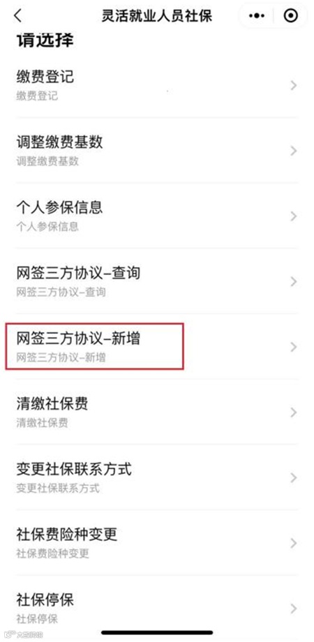 (1)进入灵活就业人员社保模块,点击选择“网签三方协议-新增”。