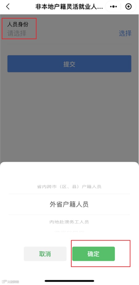 (7)进入下一步后选择对应的“人员身份”后点击“确定”,然后按照提示上传“附送资料”后点击“提交”,缴费登记提交成功。