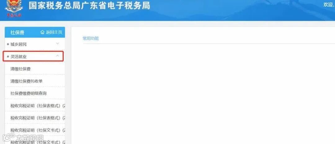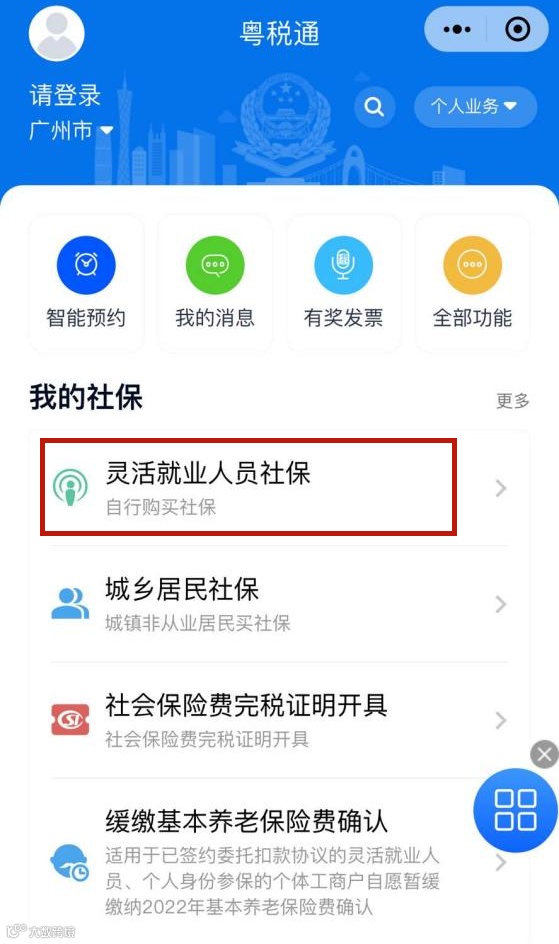(2)“粤税通”小程序实名认证登录后,在首页点击“灵活就业人员社保”。