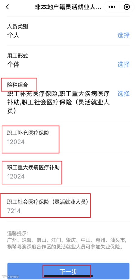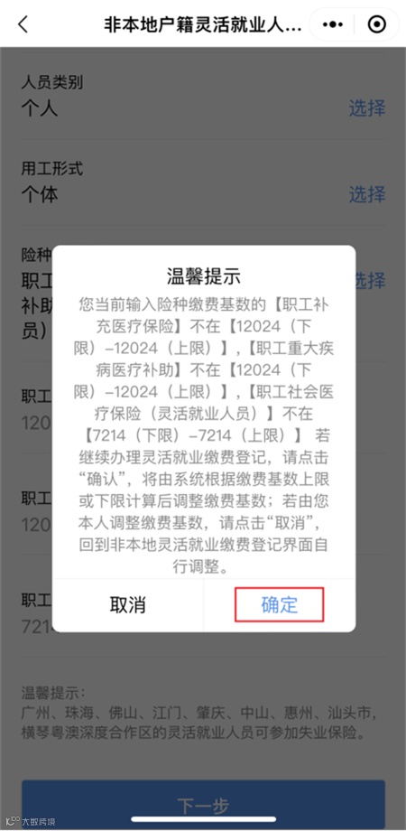 系统提示需要填写各个险种缴费基数(有上下限规定),确定基数后点击“下一步”。