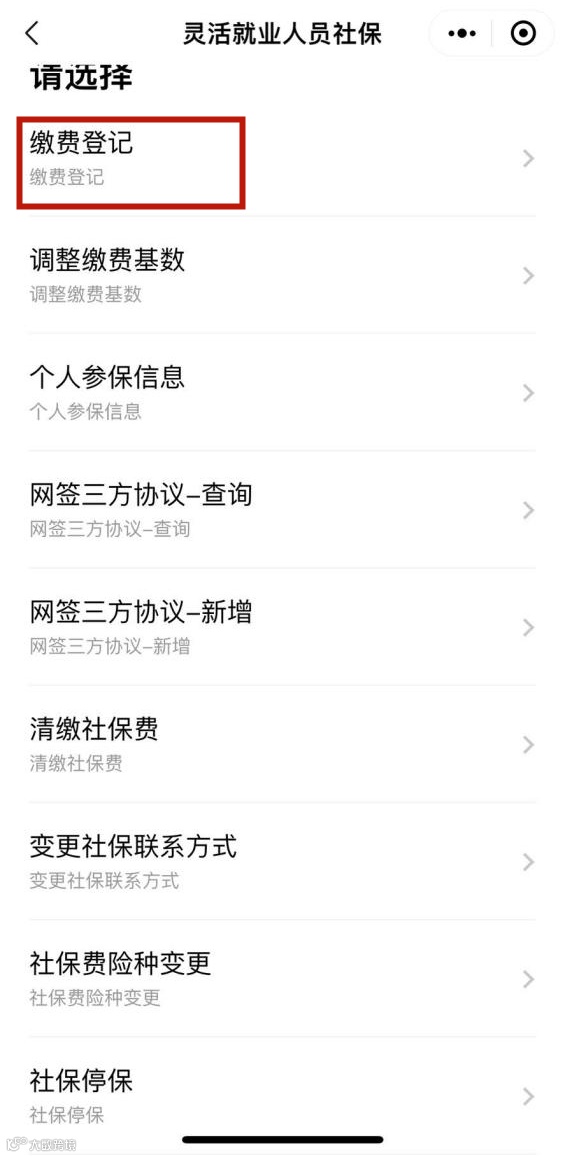 (3)进入灵活就业人员社保模块,点击选择“缴费登记”。