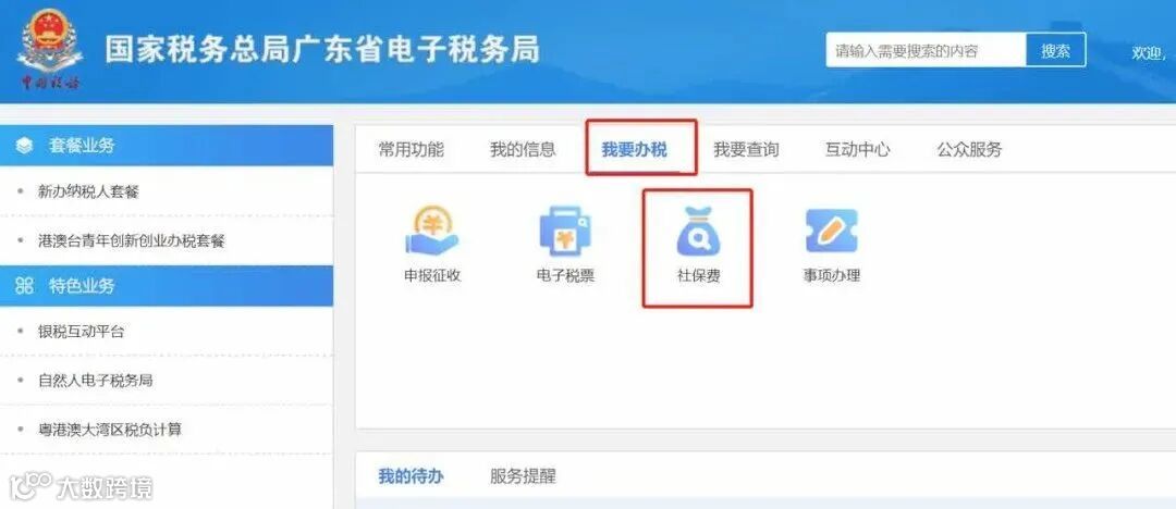 1、登录广东省电子税务局后点击【我要办税】——【社保费】进入社保费办理界面。