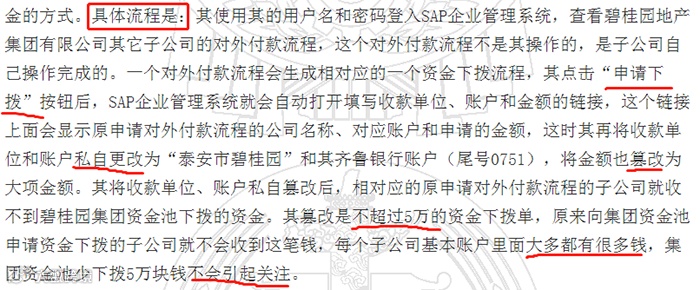 据悉,李某因负责十余个碧桂园旗下项目公司的资金结算工作,总计117个账户,所以,他可以登入SAP企业管理系统,查看总部对其他子公司的付款流程,这个流程是其他子公司自己操作的,李某也能操作修改。