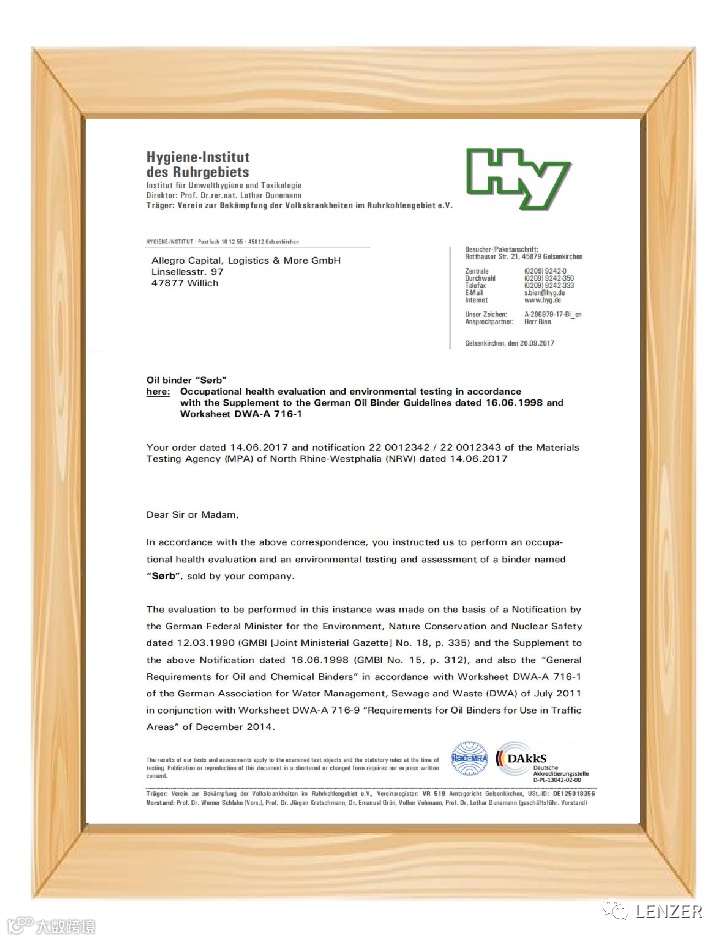 卫生检测报告是由德国鲁尔区卫生研究所(Ruhr District Institute of Hygiene),一家专业从事环境资源保护以及材料和产品检测的机构检测出具的。