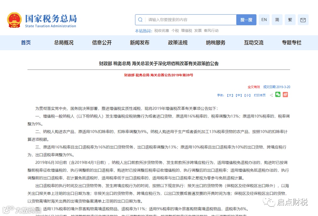 《财政部 税务总局 海关总署关于深化增值税改革有关政策的公告》(财政部 税务总局 海关总署公告2019年第39号)