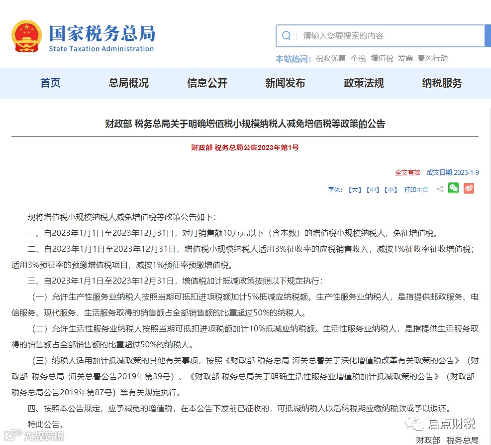 《财政部 税务总局关于明确增值税小规模纳税人减免增值税等政策的公告》(财政部 税务总局公告2023年第1号)