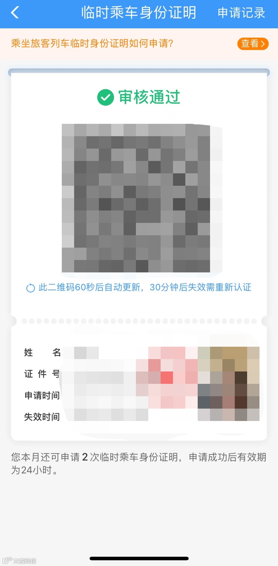 申请成功后,非注册用户关闭二维码使用页面后,重新查看时需再次进行实人核验;注册用户在退出登录、缓存清理后,重新查看时需再次进行实人核验。