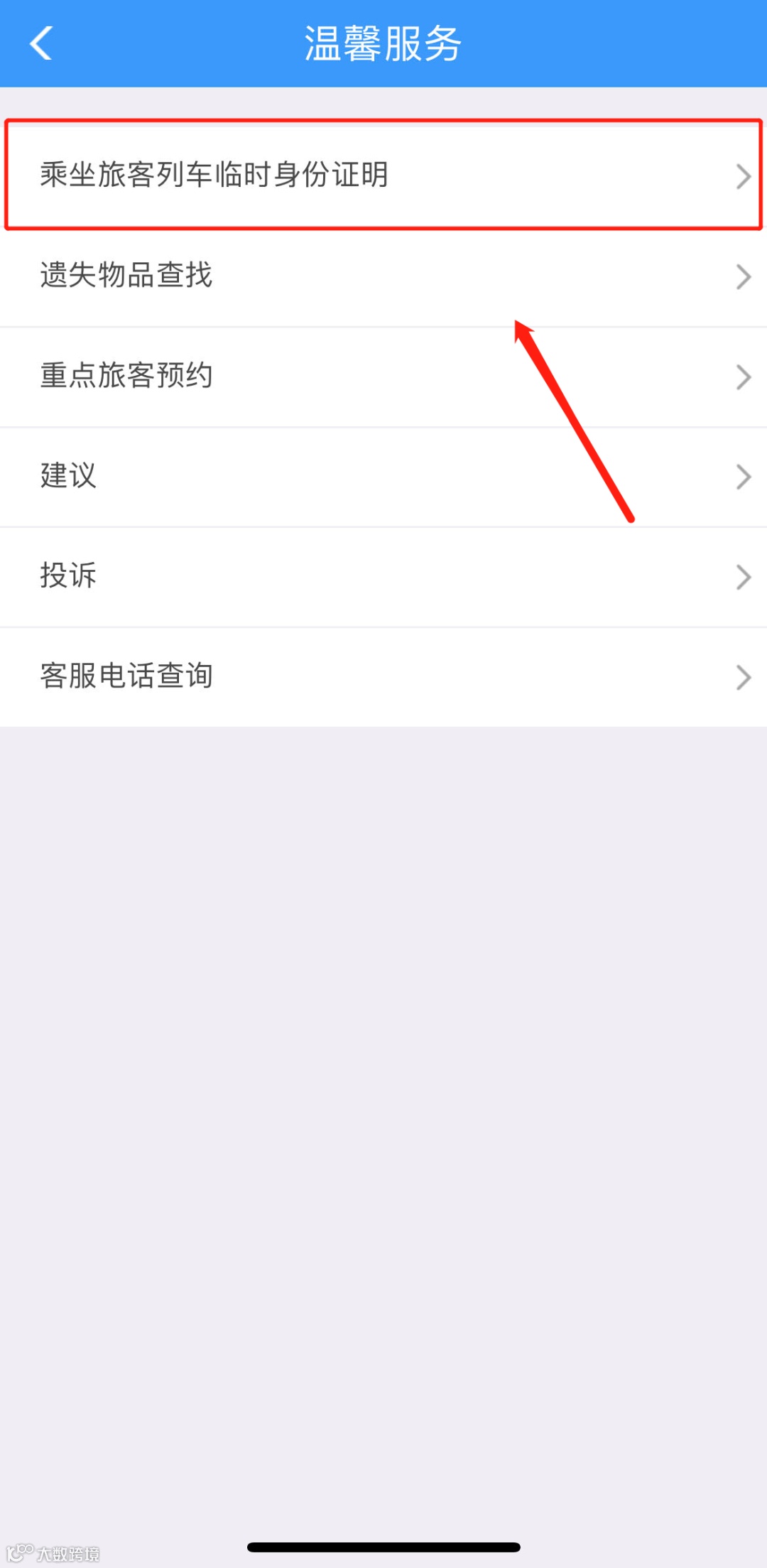 第一步,打开铁路12306APP,点击“温馨服务”,选择“乘坐旅客列车临时身份证明”;