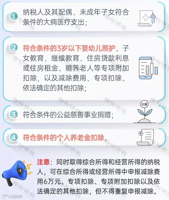 (3)其他扣除:个人养老金、个人缴付符合国家规定的企业年金、职业年金,个人购买符合国家规定的商业健康保险、税收递延型商业养老保险的支出以及国务院规定可以扣除的其他项目。