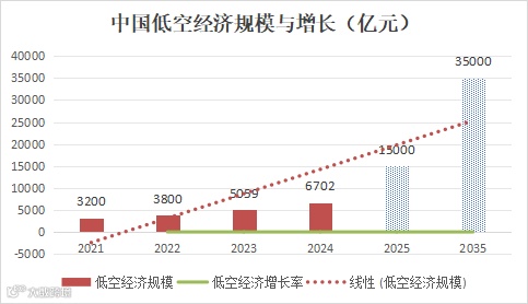 2023年全球低空经济核心产业市场规模为2.08万亿元,2024年全球低空经济市场规模预计将达到2.32万亿元,未来五年复合年增长率预计为11.51%;而2023年中国低空经济规模达到5059.5亿元,增速高达33.8%,预计2025年市场规模将突破1.5万亿元,到2035年有望达到3.5万亿元。