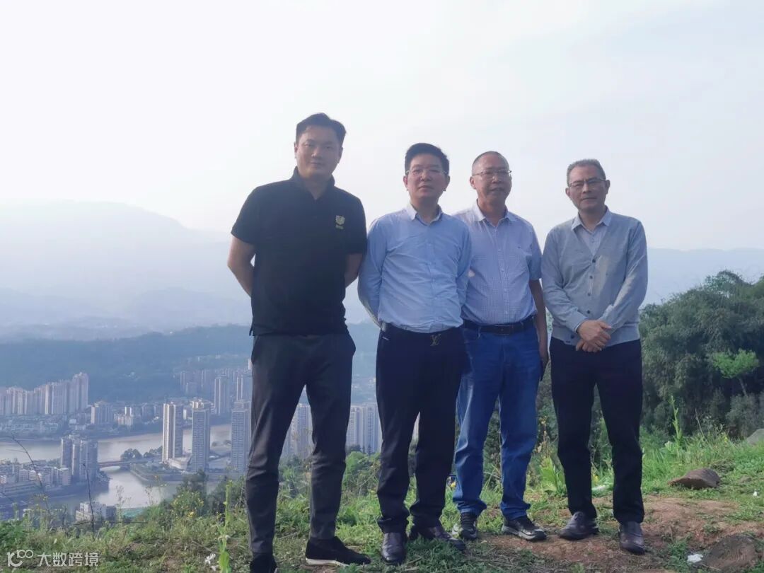 “不周山遗迹古国”近在咫尺的雅安城区,考察代表合影。左起:中铸控股有限公司副总经理.中铸恩泰(北京)国际贸易有限公司总经理卢昕杰、广东玖顺控股有限公司总裁左永忠、雅安周公山天宝旅游有限公司董事长杨宗亭、央视一级巡视员吴世平