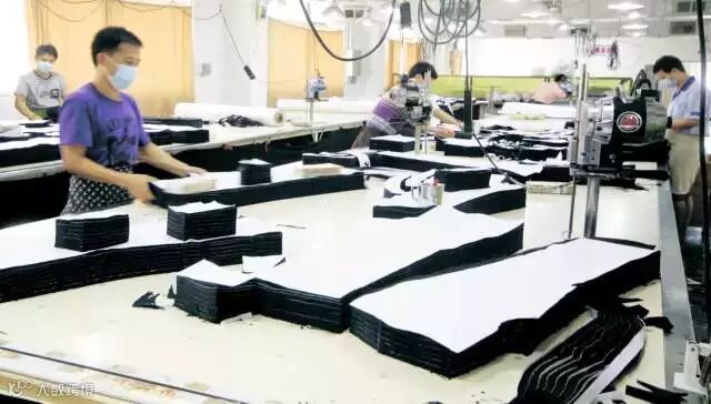 二、剪裁 :先用电刀按版型初步剪裁,再用龙门刀进行精确剪切。粗裁和精裁两道工序,使版型更加精准,衣片边沿干净整洁。