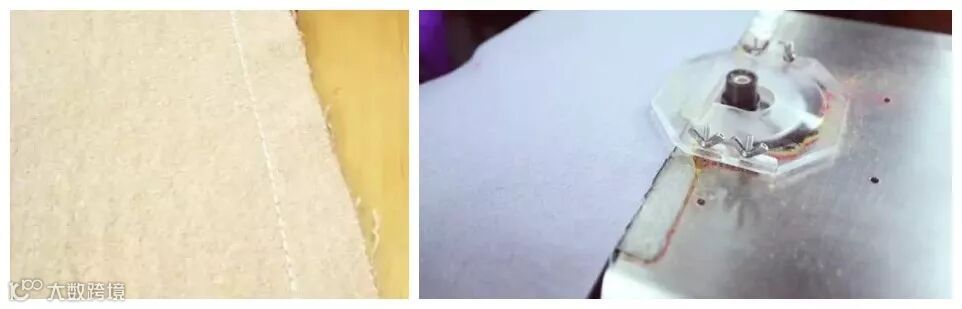 采用专业机器把双面呢横向剖开至定位线处,将连接两层面料的结节纱轻轻割开。这是一步非常精细的操作,在剖缝过程中要保证面料平整不能有一点破损。