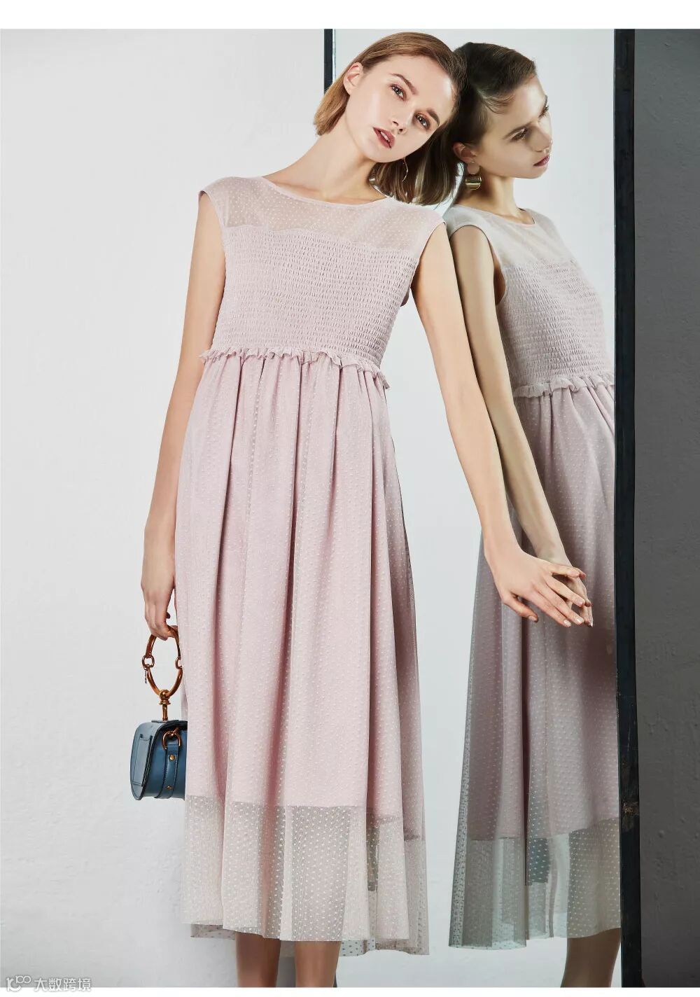 粉色无袖连衣裙,既能体现女性的优雅又能增加整体造型的质感和气质。
