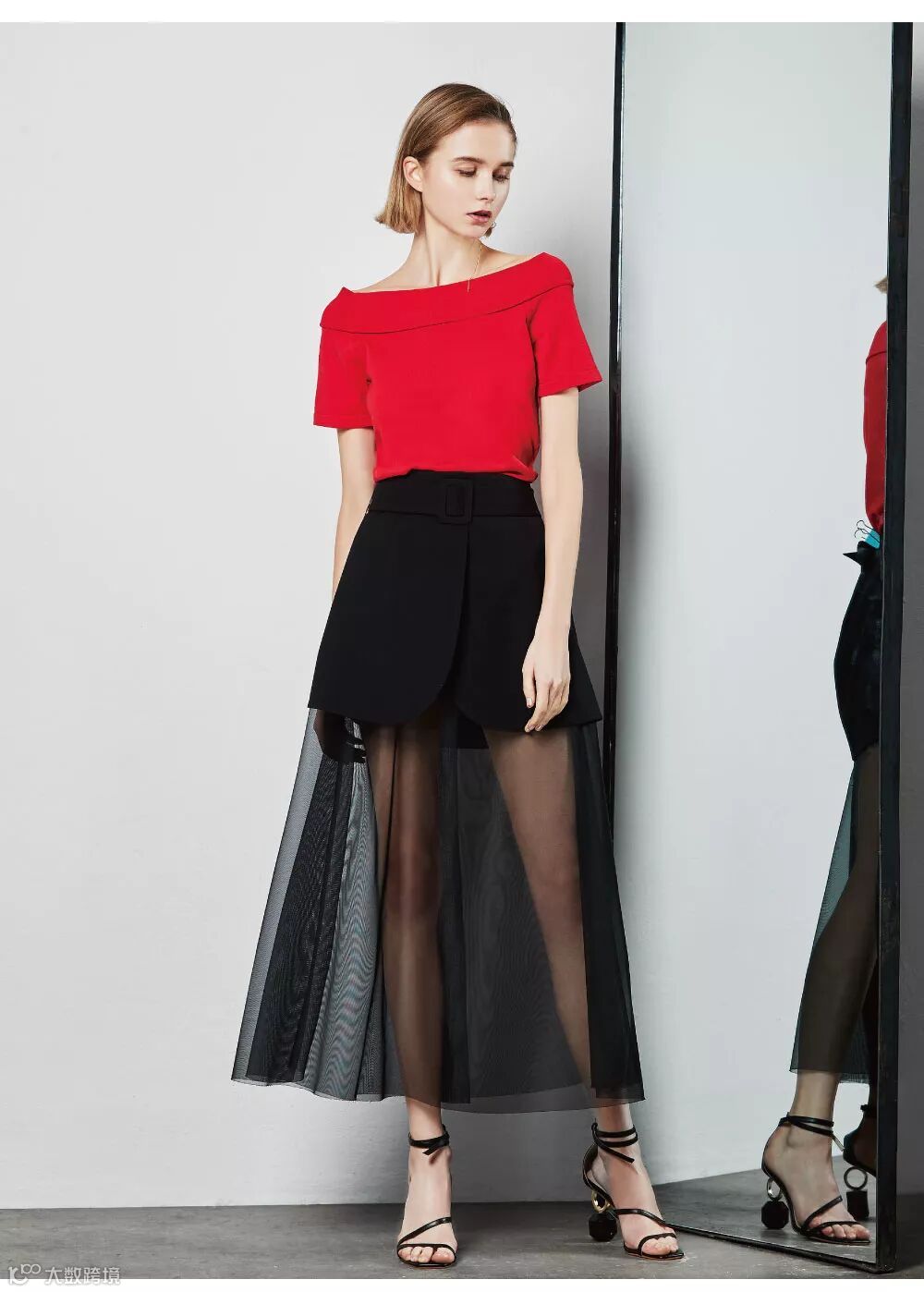 长到小腿肚的纱裙,不仅延续了短裙的简洁帅气,还有着长裙的飘逸感,既可以穿着去上班,又可以穿着去逛街,搭配一字肩。