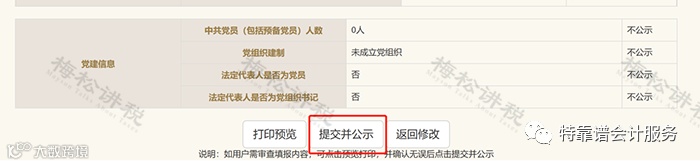 点击【预览并公示】会展示全部已填报信息,公司填报人员对填报的内容可以进行最后一次检查,若信息无误,则点击【提交并公示】,若有错误需要进行修改,则点击【返回修改】。