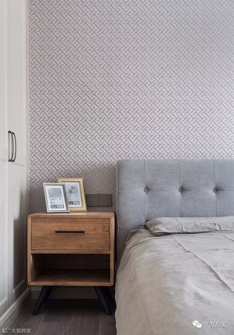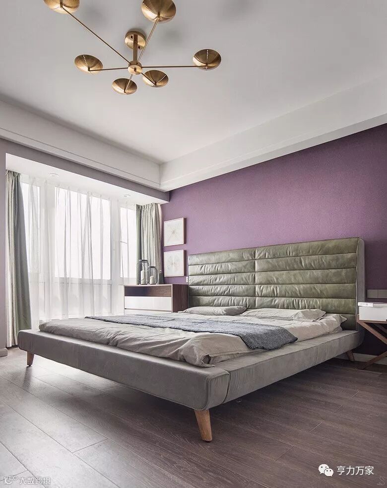 ▲以稳重安静为考虑因素,在整体设计中卧室以让人沉静的浅色为点缀色,与整体硬装相结合。简约大气的床背造型搭配弧型床头柜,金箔贴面的柜面效果,使得空间效果上多了一些奢华品味。