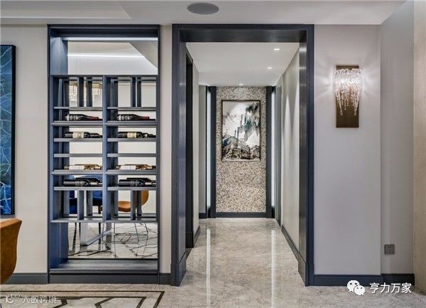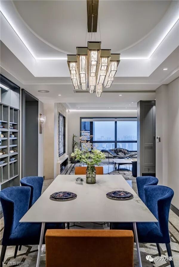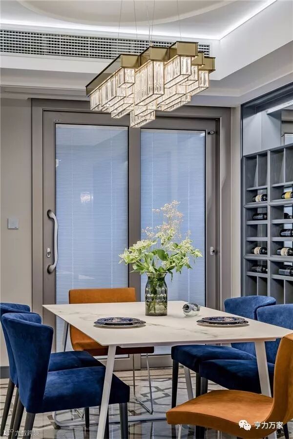 象征幸福的宝蓝色,搭配时尚前卫的橘色,静谧中又多了几分热情几许活力,散发出迷人光彩,暖色的灯光打在满墙的酒柜上,加上绿植的点缀,让就餐变成了一场视觉的盛宴。