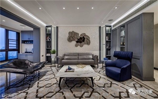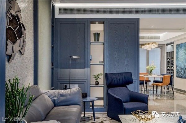 客厅以陶瓷白为主色调,加之宝蓝色沙发的点缀,静谧而优雅。简单的现代家具、展示柜、布艺、护墙板等,使客厅线条感清晰,明净而雅致。背景墙上的挂画有效的将平板电视包裹其中,在不牺牲娱乐的同时,让空间变得更为整洁舒适。