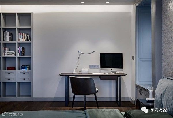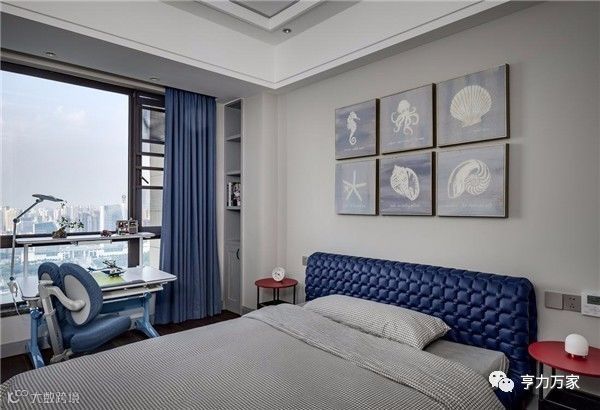 卧室是一切喧闹暂停的地方,将沉稳的蓝色与素净的白色融合在一起,可以营造一种视觉上的洁净感与平衡感,使整个空间洋溢出平静而舒适的气氛。电动窗帘的加入,更是让空间的舒适度达到了最高点。