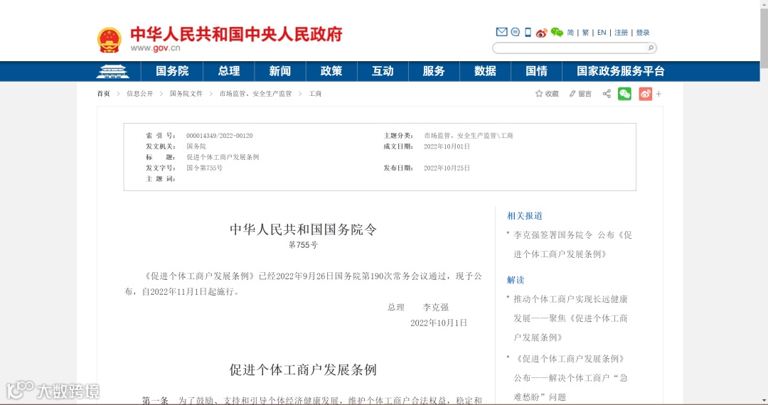 2022年10月1日,国务院公布《促进个体工商户发展条例》,2022年11月1日起正式实施,《个体工商户条例》同时废止。