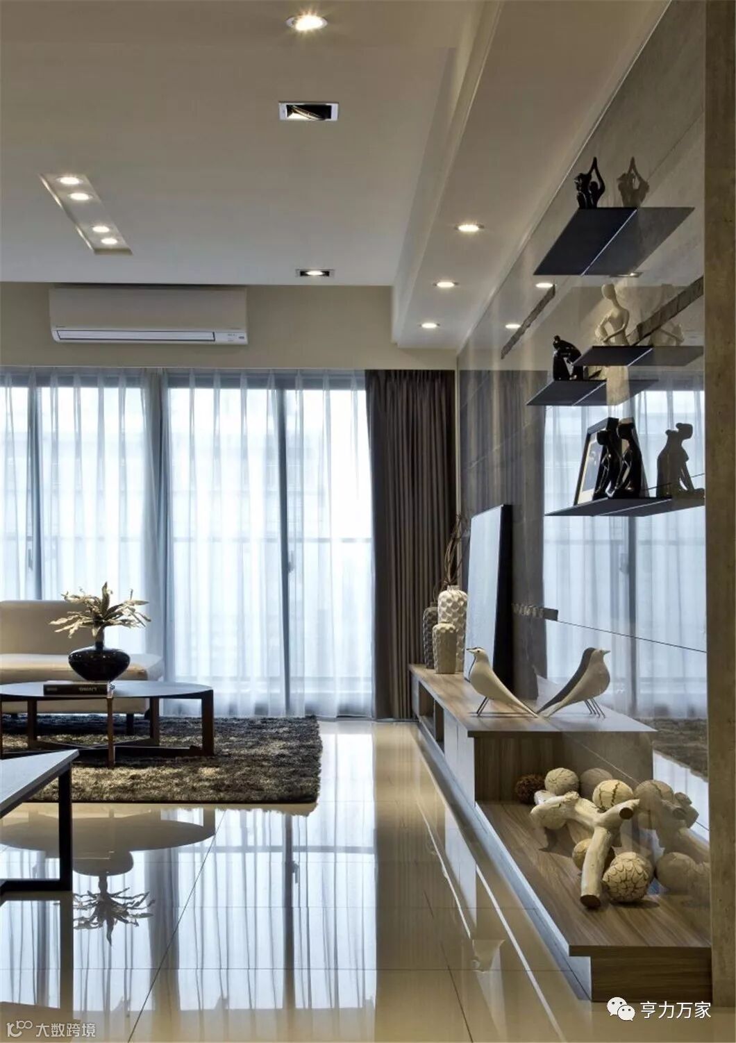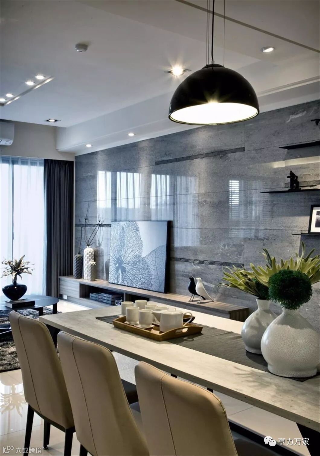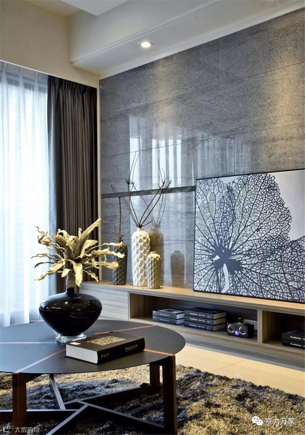 在客厅的电视墙,则选用富有自然纹理的灰色大理石佐以切割线描绘,搭配铁件交错挹注展示功能,使立面表情更形利落优雅。