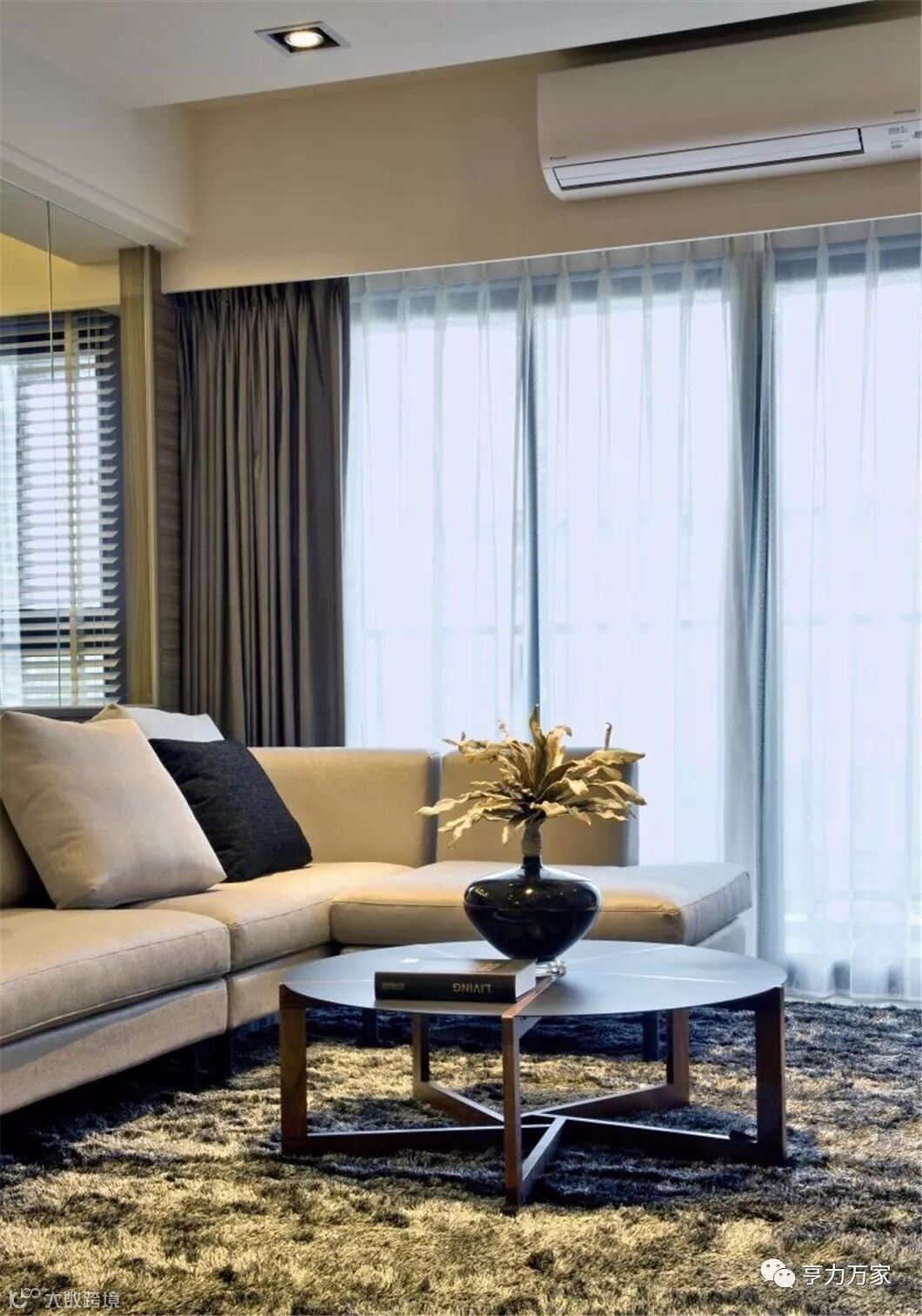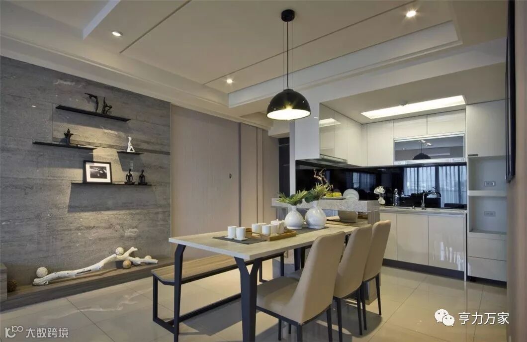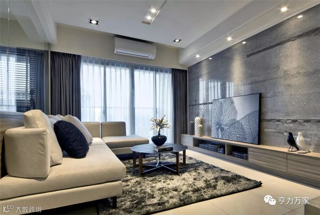 在客厅的电视墙,则选用富有自然纹理的灰色大理石佐以切割线描绘,搭配铁件交错挹注展示功能,使立面表情更形利落优雅。