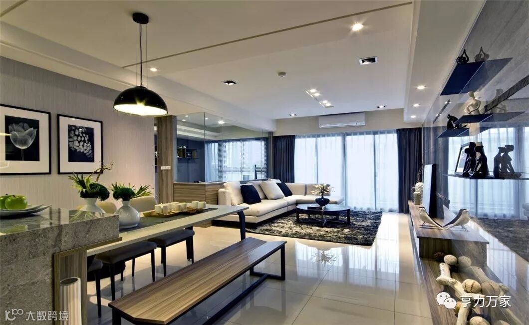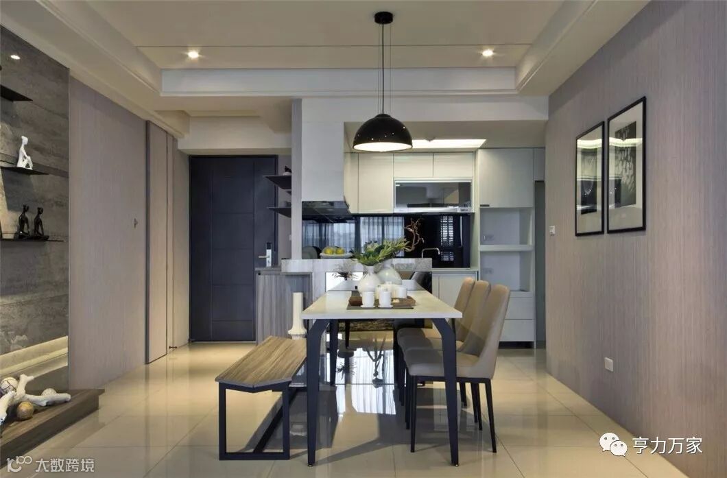 风格铺排上,公领域引用强化玻璃建构书房隔间,透过建材特质营造穿透、延伸的视觉效果,拓大厅区的空间感,且促成生活中的视线交流。