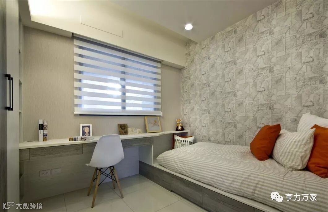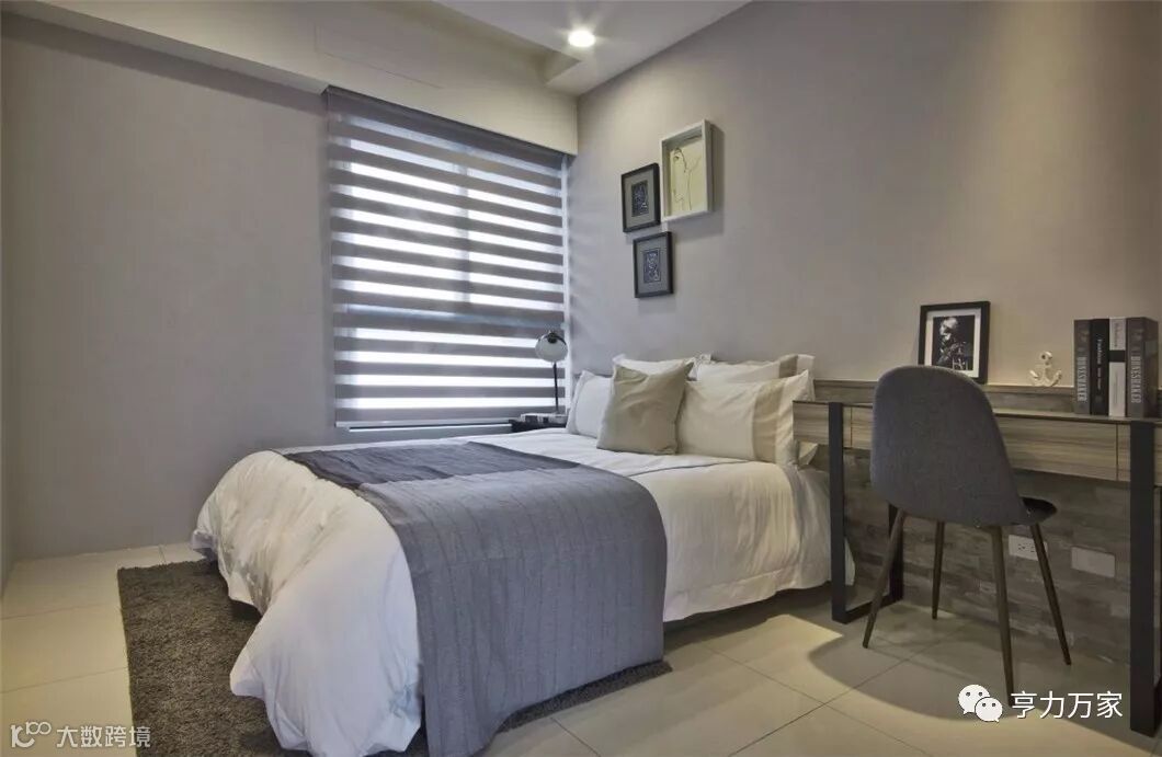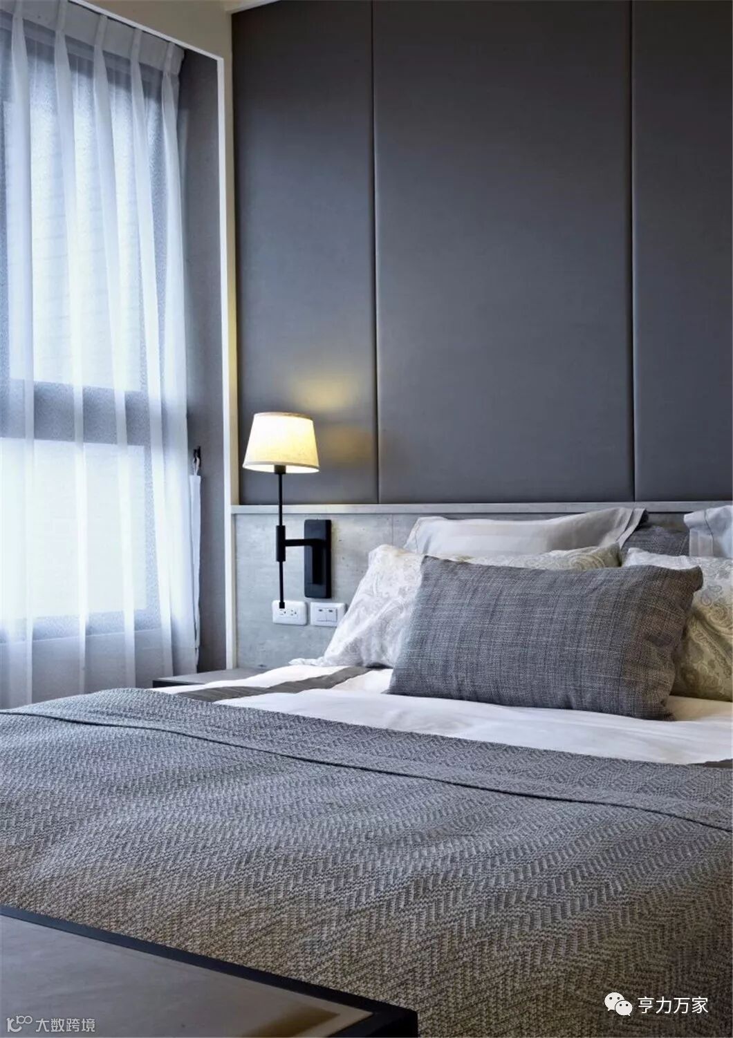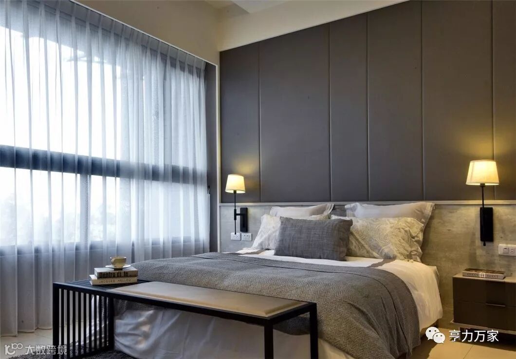 主卧内,采以质感温润的裱布包覆床头墙,下半部则刻意拼接仿清水模肌理,搭配着床头灯与自然采光的温润照拂,展现简洁雅致的起居样貌!