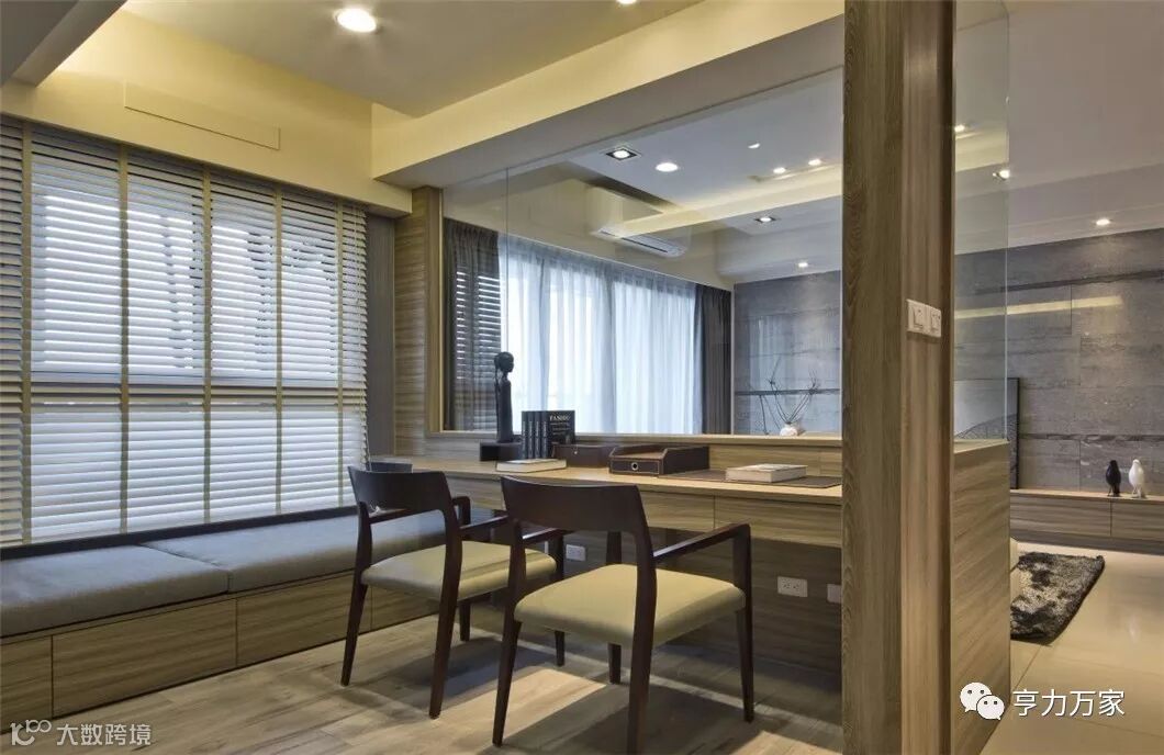 而步入书房内,则在地坪转为耐磨木地板,划出独立的使用范畴,窗边的卧榻规划,也开启了更多的机能使用。