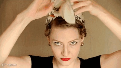 将丝巾从后脑勺绕到额头上方,在头顶紧紧系上两层结,并用发夹将丝巾固定在头发两侧。