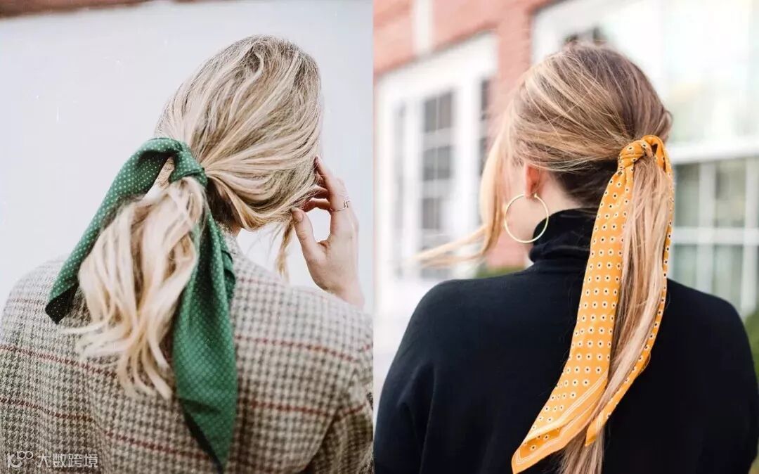 先将头发扎成一个马尾,之后系上一条丝巾即可。