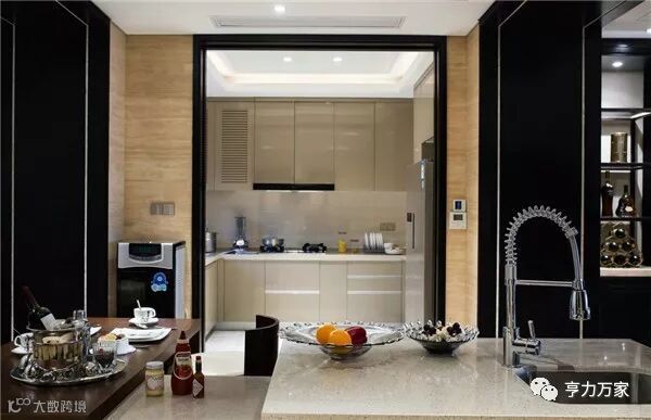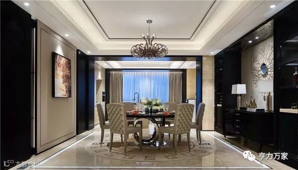 木质与金属结合的餐桌吻合当代的一个设计手法,同时增加了幸福的体验。米白、棕、灰、黑用色低调,整体和谐却无不体现着高贵优雅。