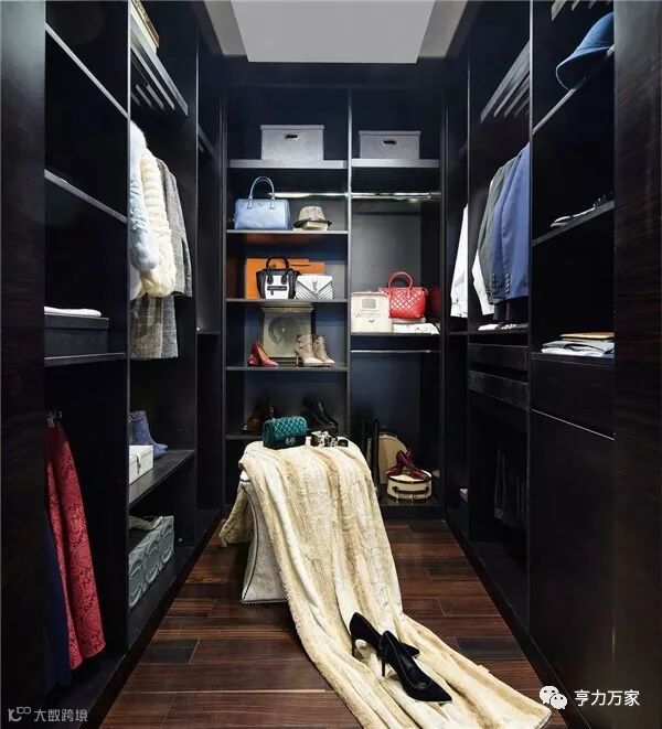 主卧的衣帽间里黑色橱柜和棕色地板带来木质优雅质感和颜色时尚体验,不规则的隔间里放着心爱的衣物,每天挑选一套开始崭新的生活,满眼都是生活沉淀后的时尚。