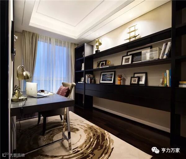作为主卧里面有着办公与静处作用的功能房,它是棱角分明的,横纵线条隔开,像是隔开了装饰品和各类书籍,也像隔开万千思绪,构成严谨逻辑框架。