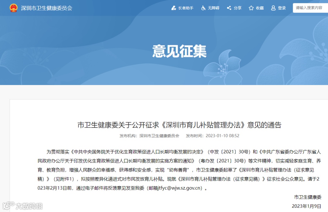为减轻家庭生育、养育、教育负担,深圳市卫生健康委起草了《深圳市育儿补贴管理办法(征求意见稿)》,拟按照差异化递进式对市民发放育儿补贴。1月10日,深圳市卫健委官网发布通告,就《深圳市育儿补贴管理办法(征求意见稿)》征求社会公众意见。